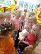 Далее, под платком, прятался мишка, у него случилась беда, оторвалась лапка. Дети вылечили его и предложили поиграть в любимую игру «У медведя во бору».