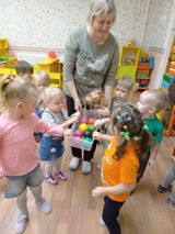 На первой остановке, детей встречала кукла Таня, которая о чём то грустила. Она рассказала о своей печали. Чтобы развеселить Танечку, дети вместе с куклой поиграли в игру «Раз, два, три - мячики лови».